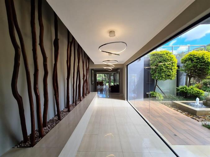 A standout feature is the glass-wrapped lounge and braai area that opens to a lush, landscaped garden, creating seamless indoor/outdoor entertaining spaces.